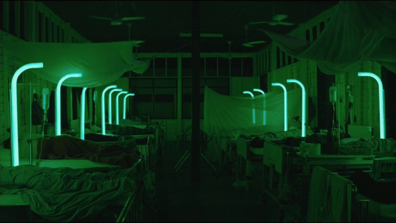 Cemetery of Splendour is, on the surface, a film about soldiers in a hospital in Khon Kaen, a small town in the northeast of Thailand. The soldiers have been struck down by an undiagnosed narcoleptic illness: in bed and unconscious, hooked up to oxygen machines and catheters as doctors try to find a cure and nurses care for their stricken bodies. One nurse on the ward, Jen, develops a close bond with a soldier, Itt, when she realises he has no family to attend him. Their relationship evolves through a series of quiet, tender encounters and moments of gentle intimacy, like Jen washing Itt’s body while he sleeps. Also wandering the ward is a medium, Keng, who is able to act as conduit for the nurses and family to speak to the soldiers as they lie in their sleep-state.
